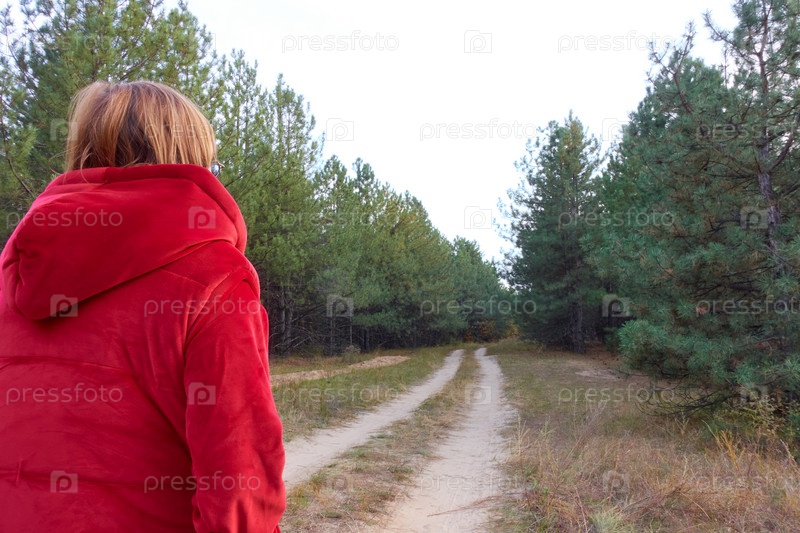 Бабушка в красной куртке смотрит на песчаную лесную дорогу, уходящую в чащу хвойного леса
