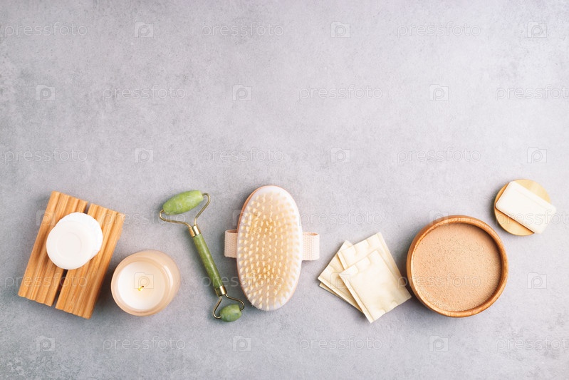 Средства личной гигиены и ухода за собой расположены на фоне серого камня, вид сверху