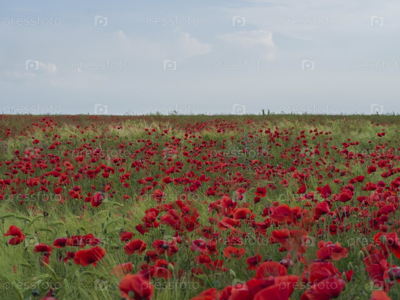 Удивительное весеннее пейзажное поле красных маков и ячменных колосьев на фоне голубого неба