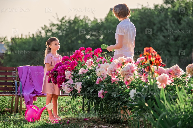 Мама и дочка в льняном розовом платье ухаживают за пионами в саду на даче, поливают цветы. Он прекрасно улыбается и смеется. Озаренный лучами вечернего заходящего солнца