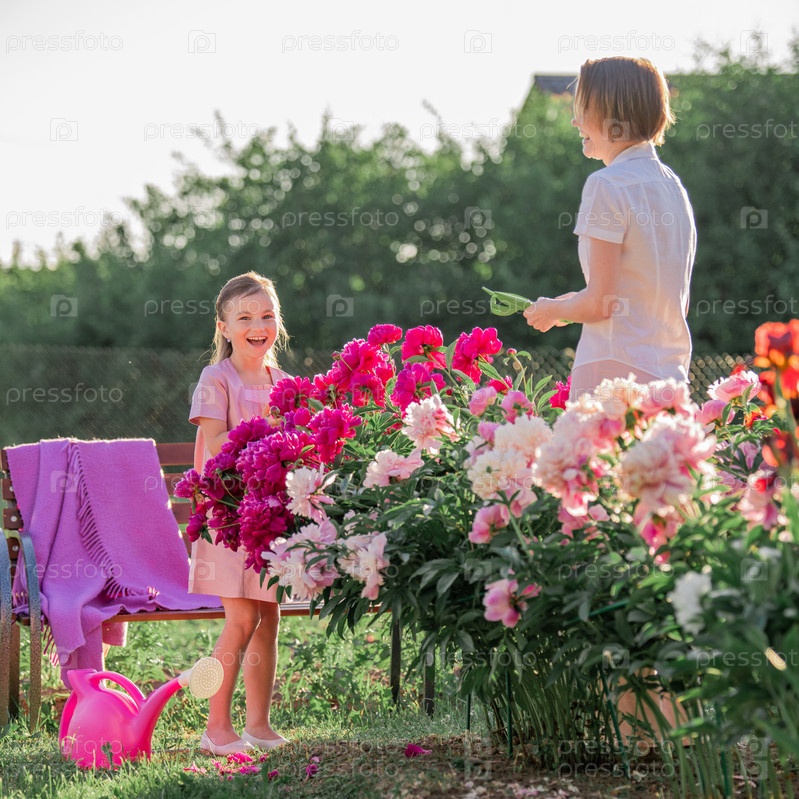 Мама и дочка в льняном розовом платье ухаживают за пионами в саду на даче, поливают цветы. Он прекрасно улыбается и смеется. Озаренный лучами вечернего заходящего солнца