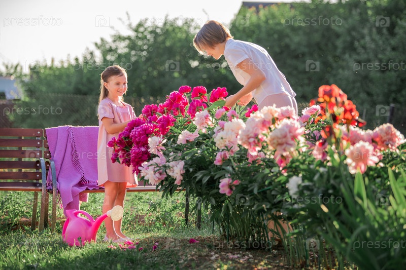 Мама и дочка в льняном розовом платье ухаживают за пионами в саду на даче, поливают цветы. Он прекрасно улыбается и смеется. Озаренный лучами вечернего заходящего солнца