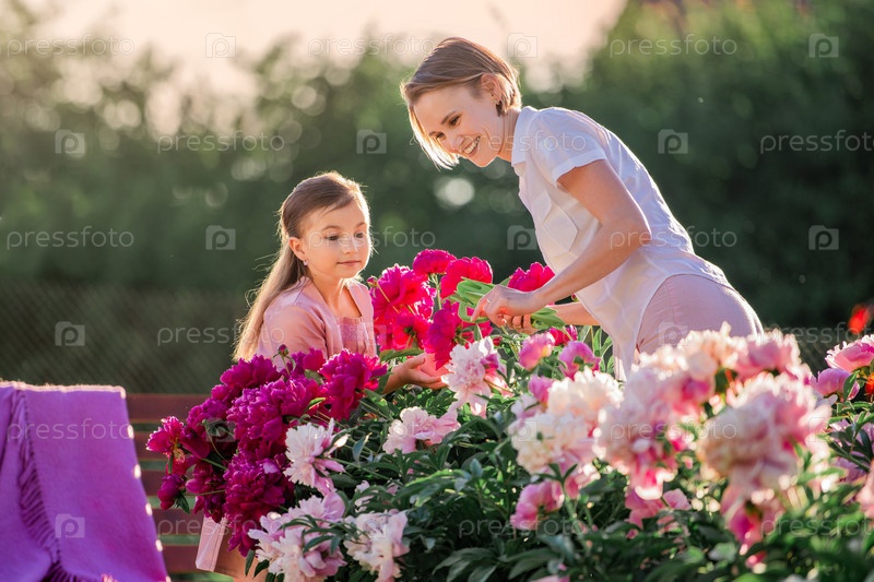 Мама и дочка в льняном розовом платье ухаживают за пионами в саду на даче, поливают цветы. Он прекрасно улыбается и смеется. Озаренный лучами вечернего заходящего солнца