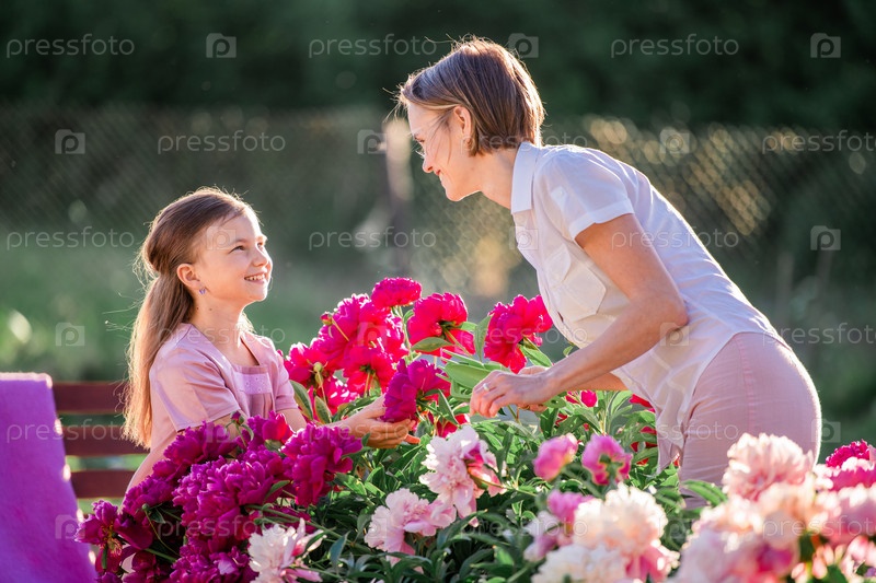 Мама и дочка в льняном розовом платье ухаживают за пионами в саду на даче, поливают цветы. Он прекрасно улыбается и смеется. Озаренный лучами вечернего заходящего солнца