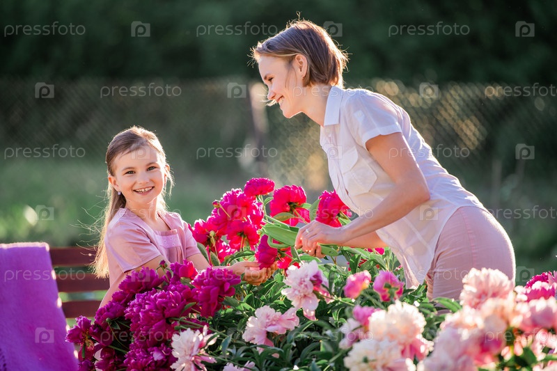 Мама и дочка в льняном розовом платье ухаживают за пионами в саду на даче, поливают цветы. Он прекрасно улыбается и смеется. Озаренный лучами вечернего заходящего солнца