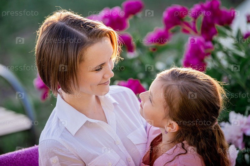Прикладные семейные отношения. Мама и дочь сидят на скамейке и болтают в саду среди цветов солнечным летним вечером