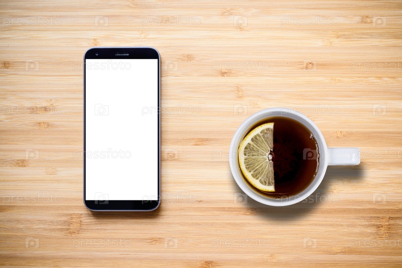 Чашка черного чая с лимоном на деревянном столе рядом с мобильным телефоном. Телефон с пустым белым дисплеем. Вид сверху