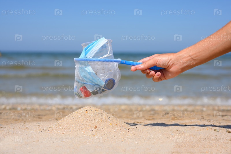Сито, полное мусора в женской руке на фоне моря. Под ситом куча чистого песка. Концепция очистки пляжа от мусора и отходов. Селективный фокус на ситовой стойке