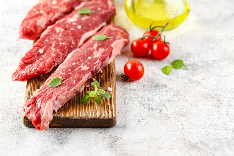 Сырой стейк со специями на деревянной разделочной доске