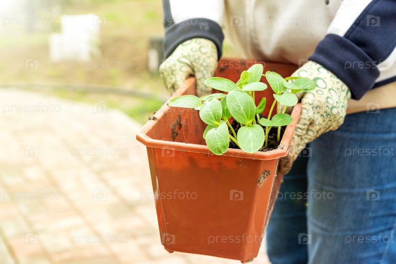 Женские руки в перчатках держат пластиковую коробку с рассадой огурцов. Выращивание органических продуктов в вашем саду