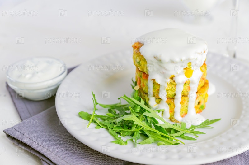 Веганские овощные бургеры с салатом из рукколы и соусом в белой тарелке, место для копирования
