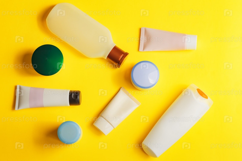 Различные красочные туалетные принадлежности красоты на желтом фоне. мужские и женские средства по уходу за волосами и телом. Вид сверху