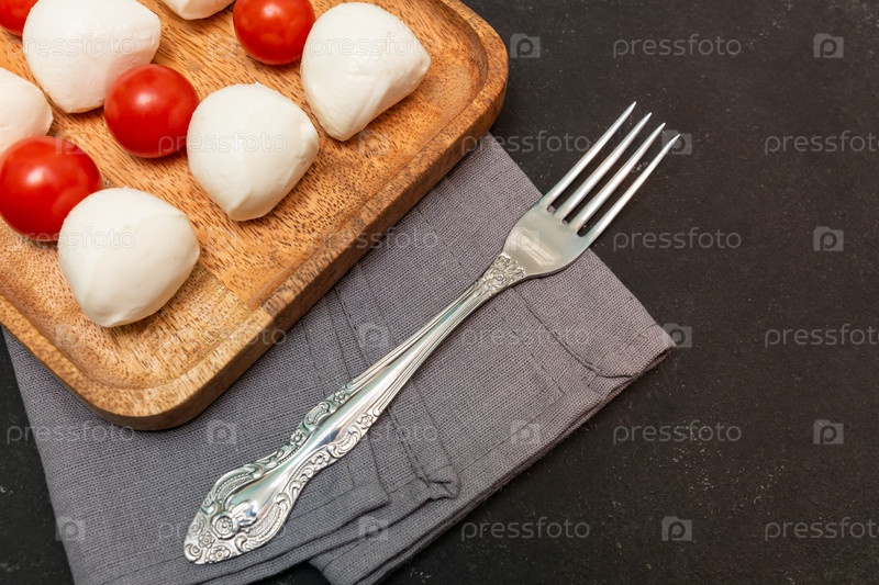 Шарики моцареллы и помидоры черри на деревянной тарелке служили закуской