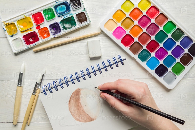 Женская рука рисует акварелью. Акварельные краски и кисти, вид сверху. Креативная художественная плоская планировка