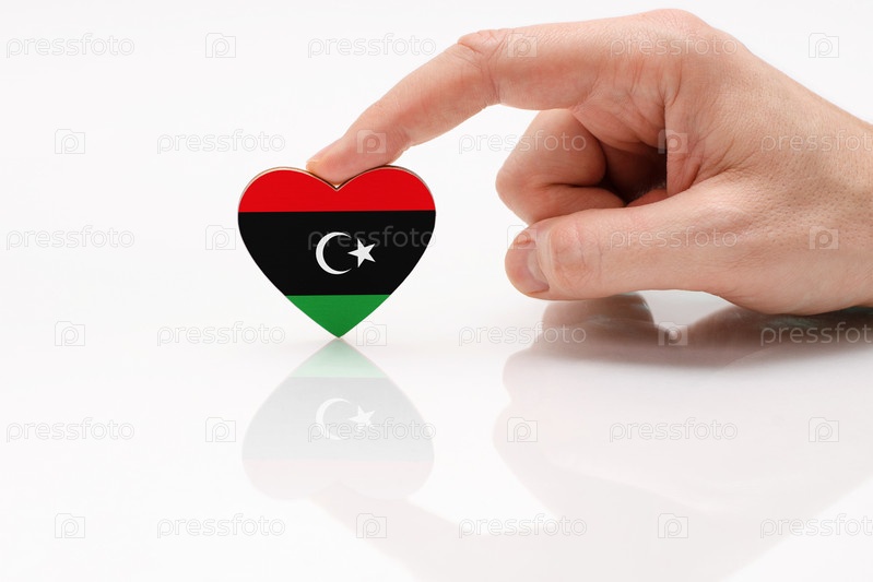 Флаг Ливии. Любите и уважайте Ливию. Мужская рука держит сердце в форме флага Ливии на поверхности белого стекла. Концепция патриотизма и туризма
