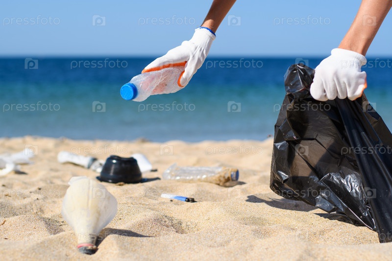Сбор мусора с пляжа туристом. защита природы от пластика