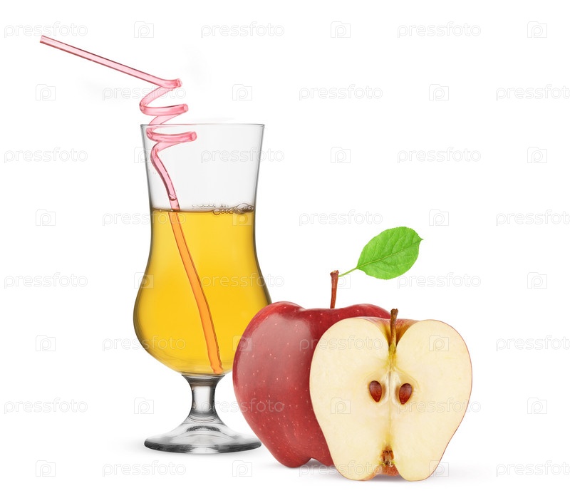 Яблочный сок в стакане с соломинкой, изолированной на белом