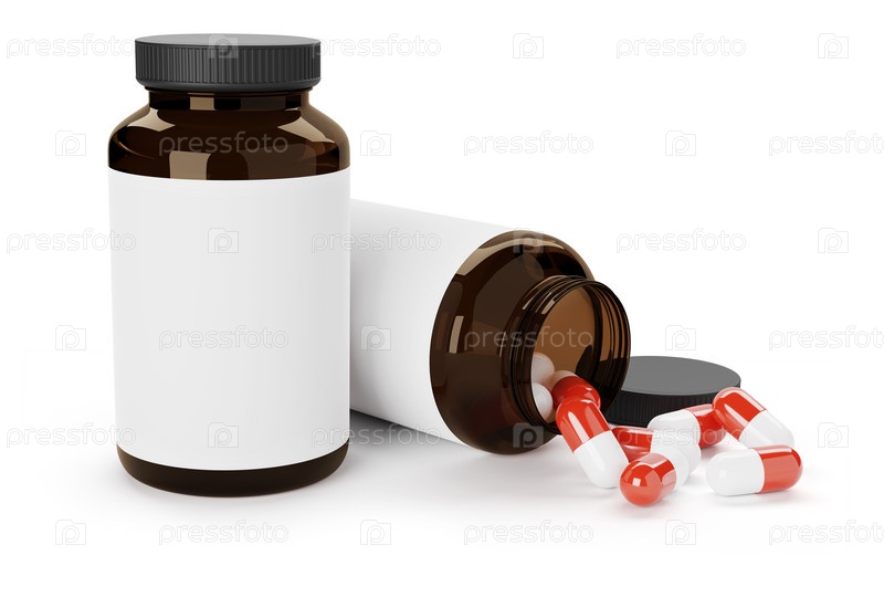 Медицинская бутылка с пустой этикеткой и таблетками. Изолированные на белом фоне