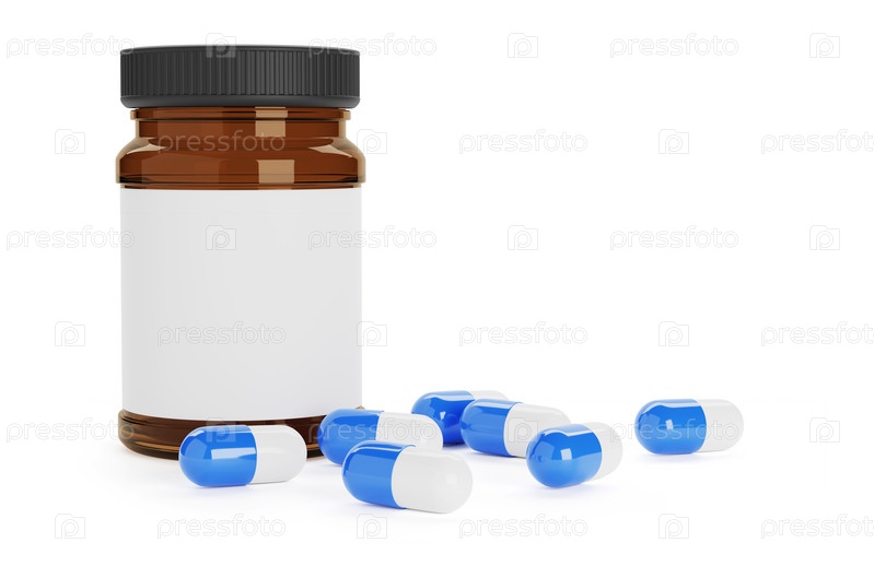 Медицинская бутылка с пустой этикеткой и таблетками. Изолированные на белом фоне
