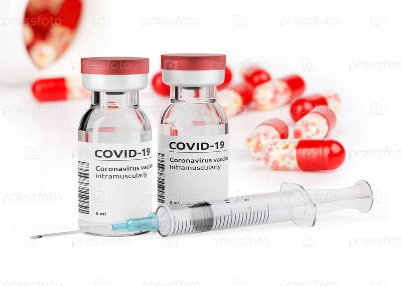 Флаконы с вакциной против коронавируса. Бутылочки с лекарствами и шприц