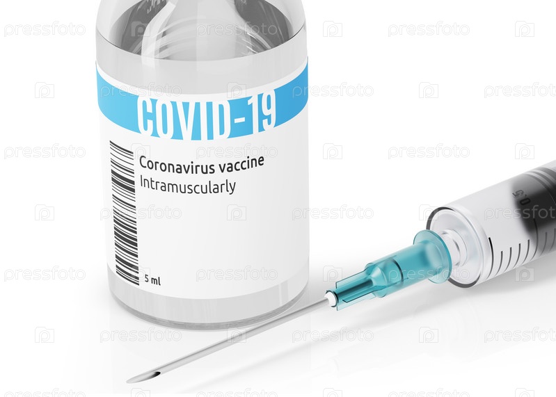 Флакон с вакциной ковид-19 и шприц, изолированные на белом фоне