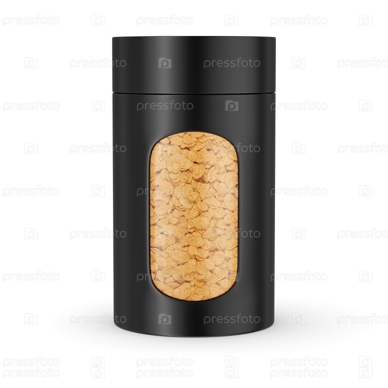 Пищевая банка с сухими кукурузными хлопьями, изолированными на белом