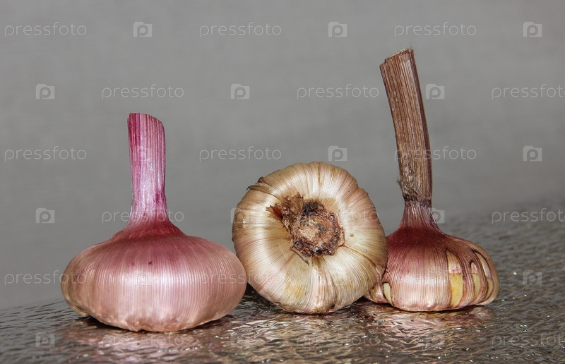 Три луковицы цветов гладиолусов разных сортов на серебряном фоне