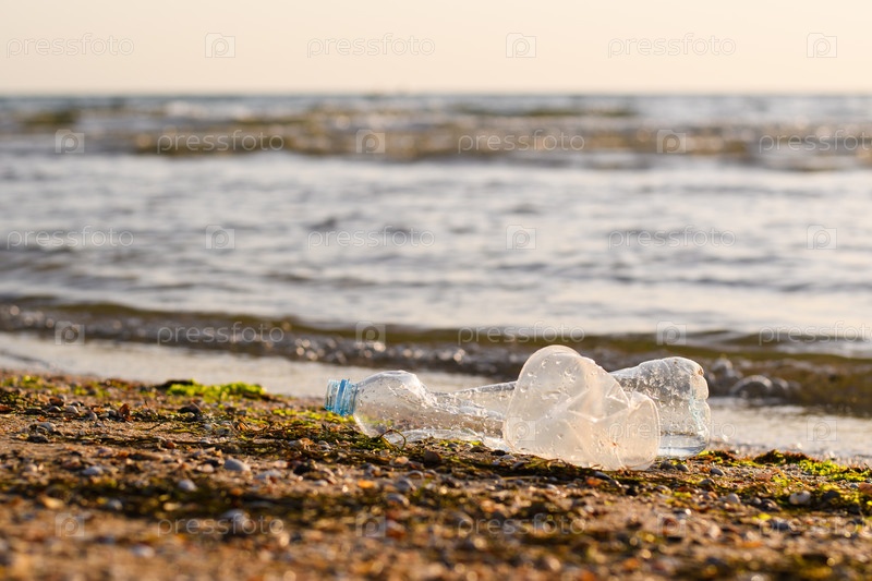 Пластиковый мусор на берегу моря во время заката. Концепция загрязнения моря бытовым мусором. Селективный фокус на бутылке