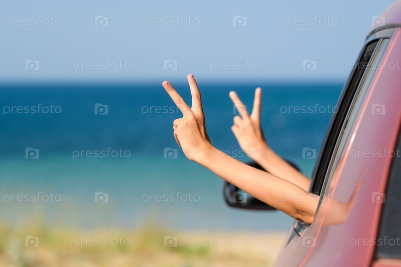 Две руки показывают положительный жест из окна автомобиля на фоне моря. Концепция успешной поездки в отпуск с друзьями или семьей. Выборочная фокусировка на ближней руке