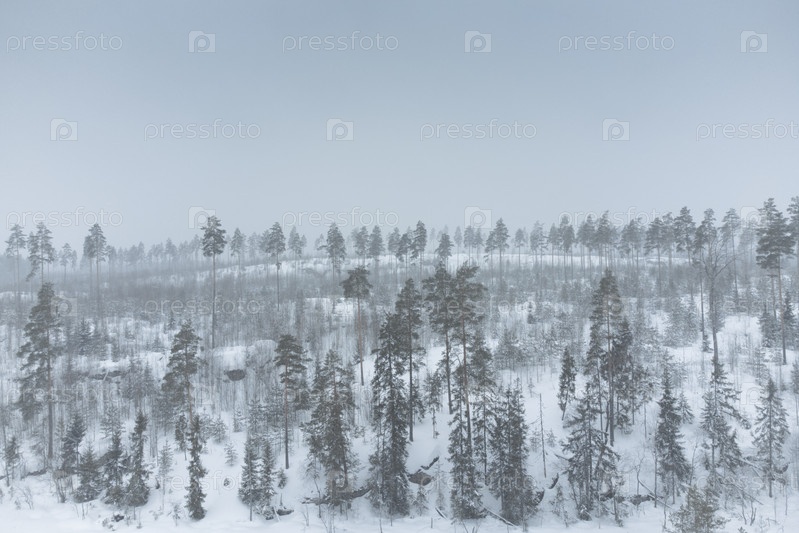Деревья на заснеженном холме. Суровая северная природа