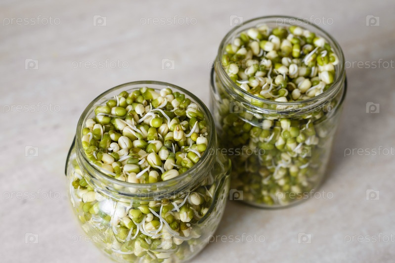 Полные банки проросших бобов мунг для здорового питания. Вид сверху, выборочный фокус на нижней банке