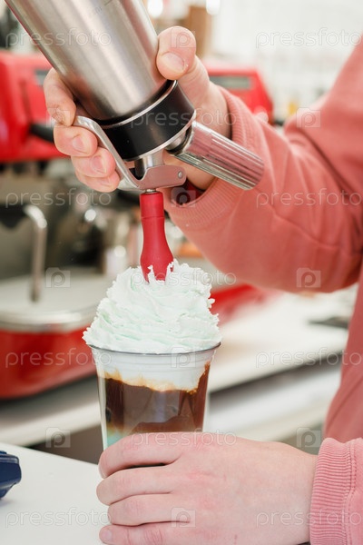 Бариста украшает коктейль взбитыми сливками и цветной посыпкой