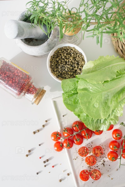 Овощи и специи. Помидоры черри, листья салата и различные специи. Красный, зеленый и черный перец