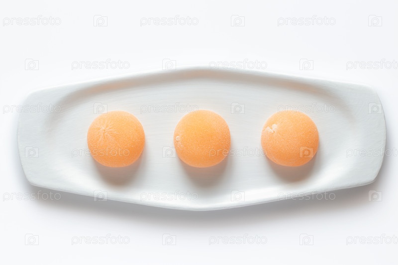 Три оранжевых моти Дайфуку выложены в ряд на белой тарелке. Традиционные японские сладости. Вид сверху, плоская планировка