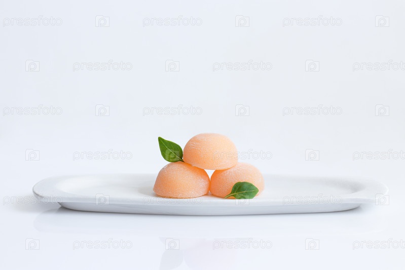 Три апельсиновых лепешки, украшенные маленькими листьями на белой тарелке. Десерт Дайфуку моти. Традиционные японские кондитерские изделия
