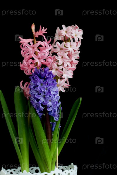 Три цветущих гиацинта в одном горшке. Соцветия разной окраски. На черном фоне