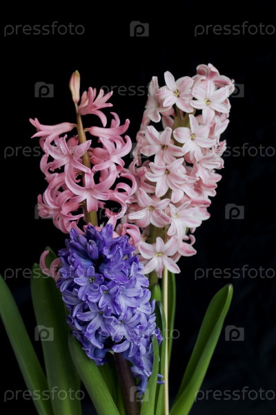 Три цветущих гиацинта в одном горшке. Соцветия разной окраски. На черном фоне