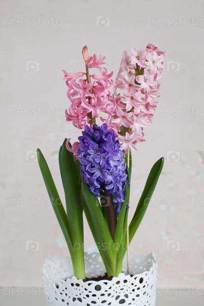 Три цветущих гиацинта в одном горшке. Соцветия разной окраски. На белом фоне