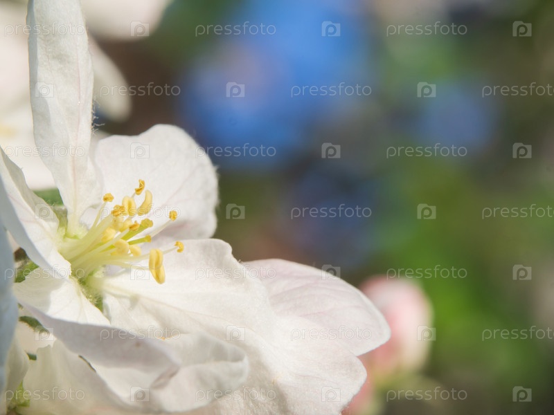 Белый цветок цветущей яблони на размытом фоне природы. Весенние цветы. Весенний фон