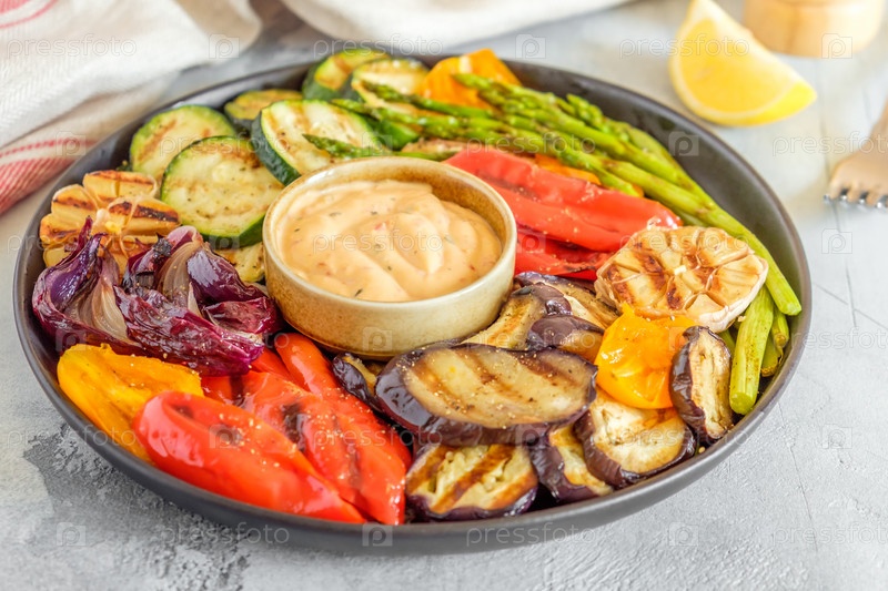 Жареные овощи на тарелке с соусом