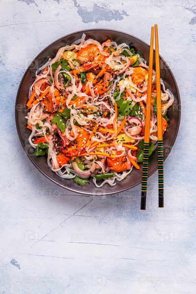 Азиатский салат с рисовой лапшой, креветками и овощами