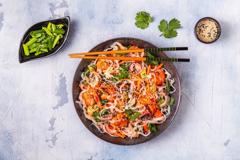 Азиатский салат с рисовой лапшой, креветками и овощами