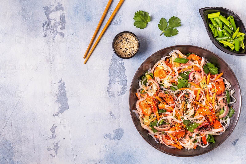 Азиатский салат с рисовой лапшой, креветками и овощами