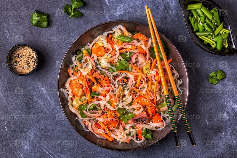 Азиатский салат с рисовой лапшой, креветками и овощами