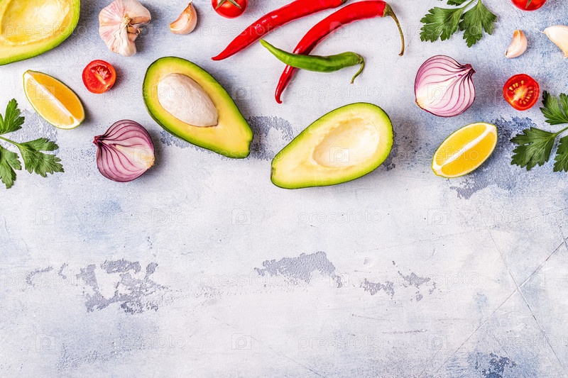Ингредиенты для гуакамоле: авокадо, лайм, помидор, лук и специи