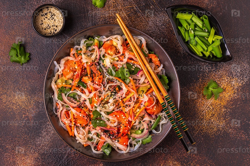 Азиатский салат с рисовой лапшой, креветками и овощами