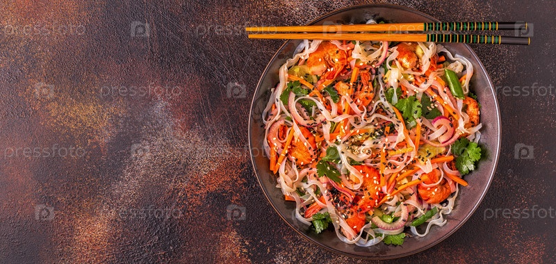 Азиатский салат с рисовой лапшой, креветками и овощами
