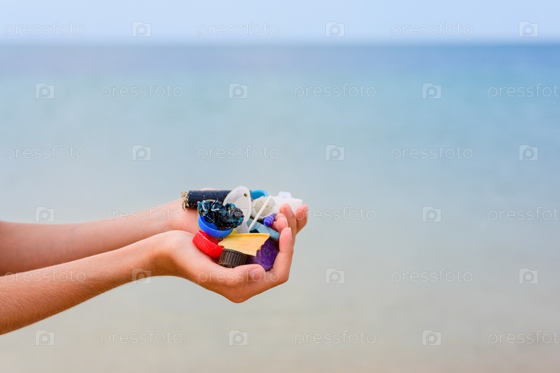 Куча мусора, собранного на пляже в руках на фоне моря. Концепция охраны окружающей среды