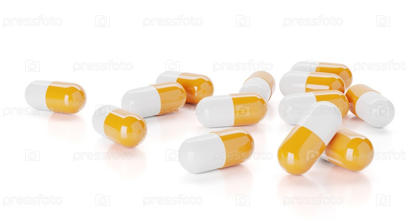 Куча желтых пилюль, изолированных на белом фоне