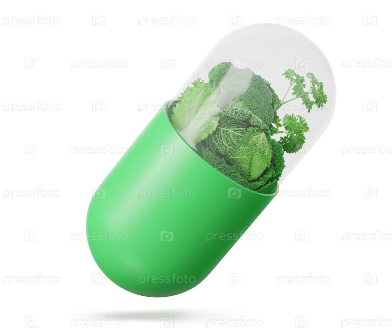 Витамины из овощей в таблетках на белом фоне